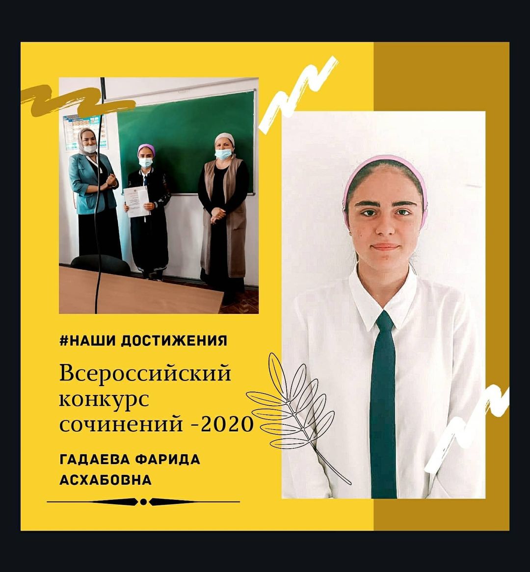 Районной грамотой награждена обучающаяся 11 класса МБОУ "СОШ #4 с.Ножай-Юрт" Гадаева Фарида Асхабовна за победу во Всероссийском конкурсе сочинений -2020