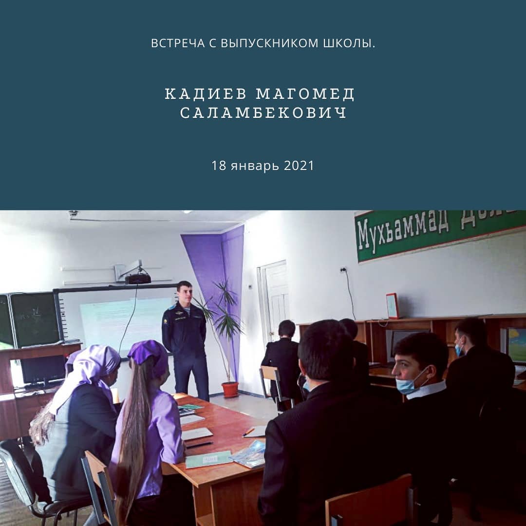 18 января 2021 года в МБОУ ,,СОШ 4 с. Ножай - Юрт" состоялась встреча с выпускником этой школы ,студентом Рязанского гвардейского высшего воздушно - десантного командного училища имени генерала армии В.Ф. Маргелова Кадиевым Магомедом Саламбековичем. Обучающиеся 11 класса проявили интерес к военной профессии, задавали ему вопросы об условиях обучения в военном училище, о проходных баллах. Магомед ответил на все интересующие ребят вопросы ,рассказал о преимуществах обучения в военных училищах,посоветовал поступать в их училище. Педагоги и выпускники школы пожелали Магомеду успешного окончания выбранного им училища.