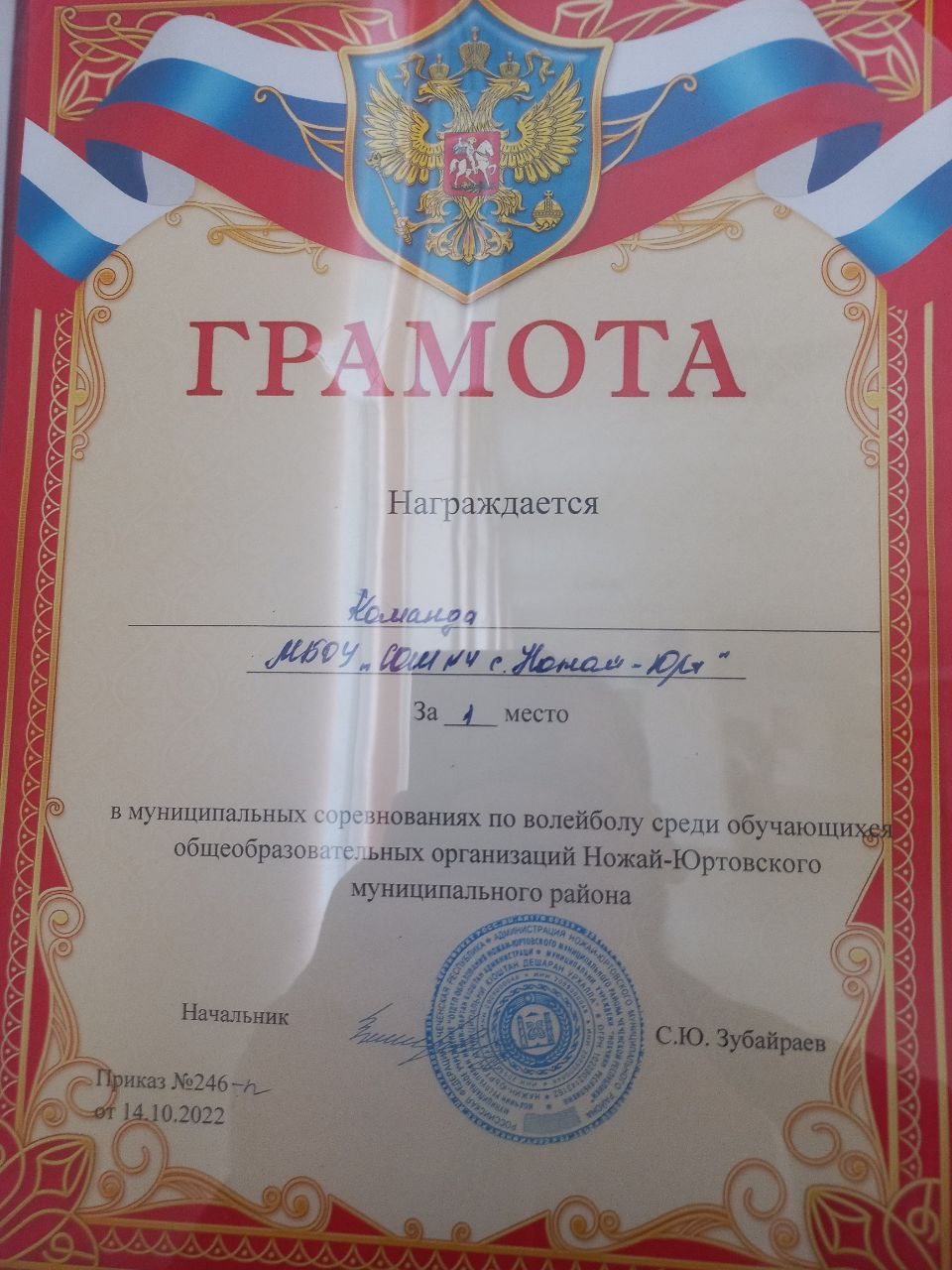 Команда МБОУ "СОШ #4 с.Ножай-Юрт" заняла 1 место в муниципальных соревнованиях по волейболу среди обучающихся образовательных организаций Ножай-Юртовского муниципального района. Дала т1аьхье