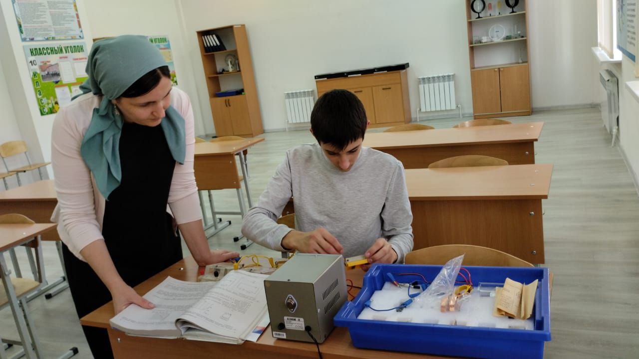 Луиза Шахрудиновна строго следит за соблюдением техники безопасности при сборке простой электрической цепи.