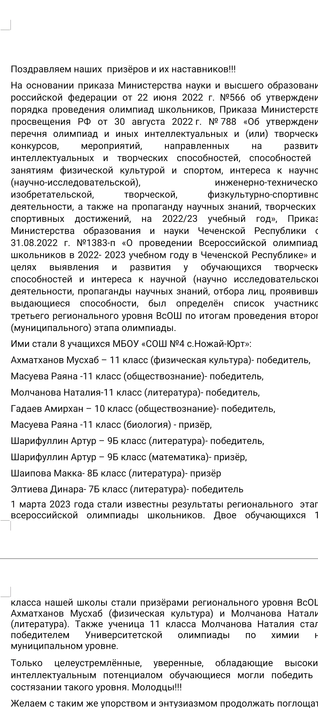 1 марта 2023 года стали известны результаты регионального этапа всероссийской олимпиады школьников. Двое обучающихся 11 класса нашей школы стали призёрами регионального уровня ВсОШ: Ахматханов Мусхаб (физическая культура) и Молчанова Наталия (литература). Также ученица 11 класса Молчанова Наталия стала победителем Университетской олимпиады по химии на муниципальном уровне.