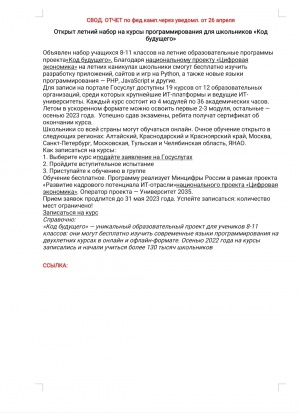Открыт летний набор на курсы программирования для школьников «Код будущего»Объявлен набор учащихся 8-11 классов на летние образовательные программы проекта«Код будущего». Благодаря национальному проек
