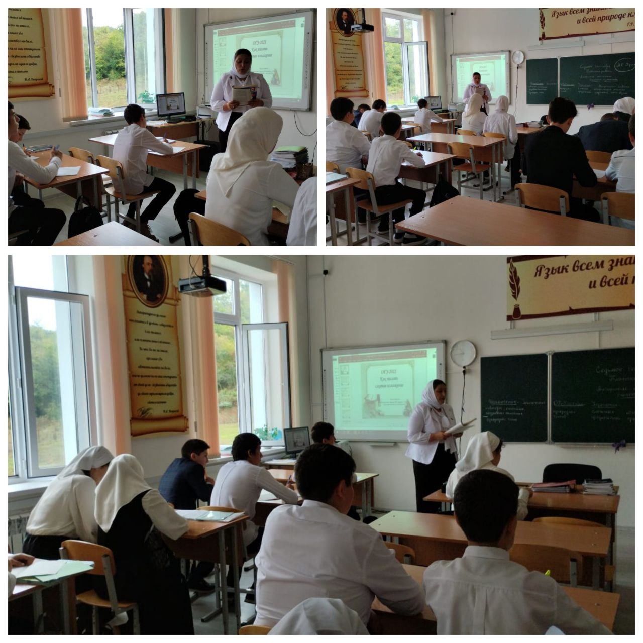 Урок русского языка в 9А классе. Учитель Магомедова З. М. проводит урок по теме ' Русский язык в современном мире". В процессе урока Зарета Мусаевна знакомит обучающихся с местом русской клас
