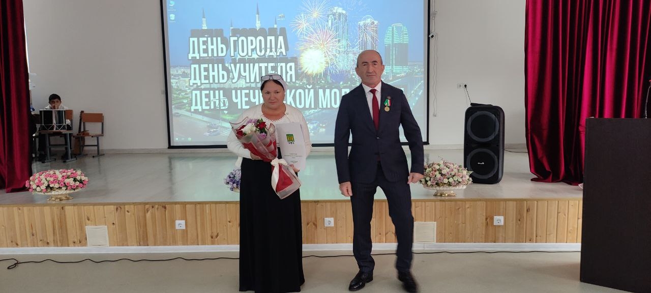Сегодня в актовом зале нашей школы прошло торжественное мероприятие, посвященное Дню Учителя. Почетной грамотой администрации Ножай-Юртовского района награждена завуч нашей школы Пригорнева Оксана Вик