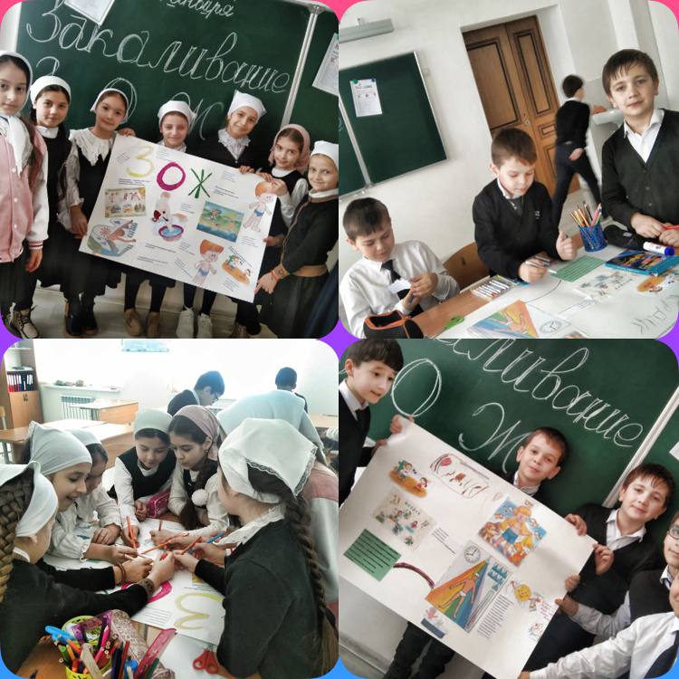 Ребята были распределены на 2 группы.Необходимо было оформить работу на ватмане.Для этого каждая группа должна была ответить на 2 вопроса, используя предложенные учителем материалы (иллюстрации, пословицы,поговорки, стихи). После завершения,каждая группа защитила свою работу. Учитель начальных классов Сембаева З.Т.