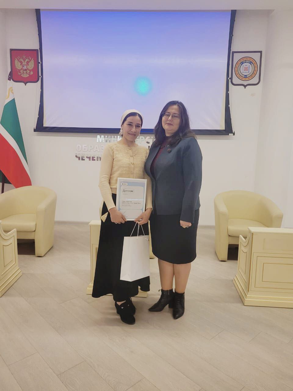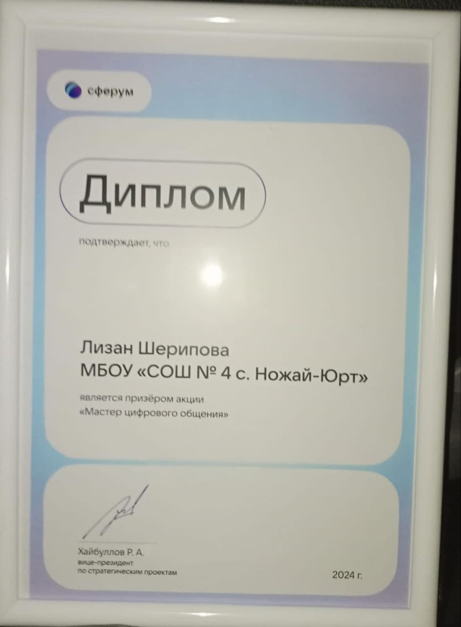Сегодня в актовом зале Министерства образования и науки Чеченской Республики прошло награждение победителей и призеров акции "Мастер цифрового общения", организатором которой является информационно-коммуникационная платформа «Сферум». Призером акции стала учитель 4 б класса нашей школы Шерипова Лизан Андиевна.