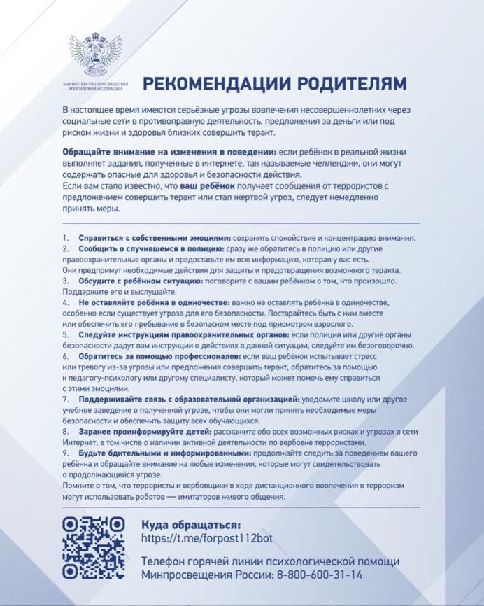 Уважаемые родители! В социальных сетях и мессенджерах началась массовая рассылка школьникам и студентам, главная цель которой – склонить ребят к совершению серьезных противоправных действий. Подо