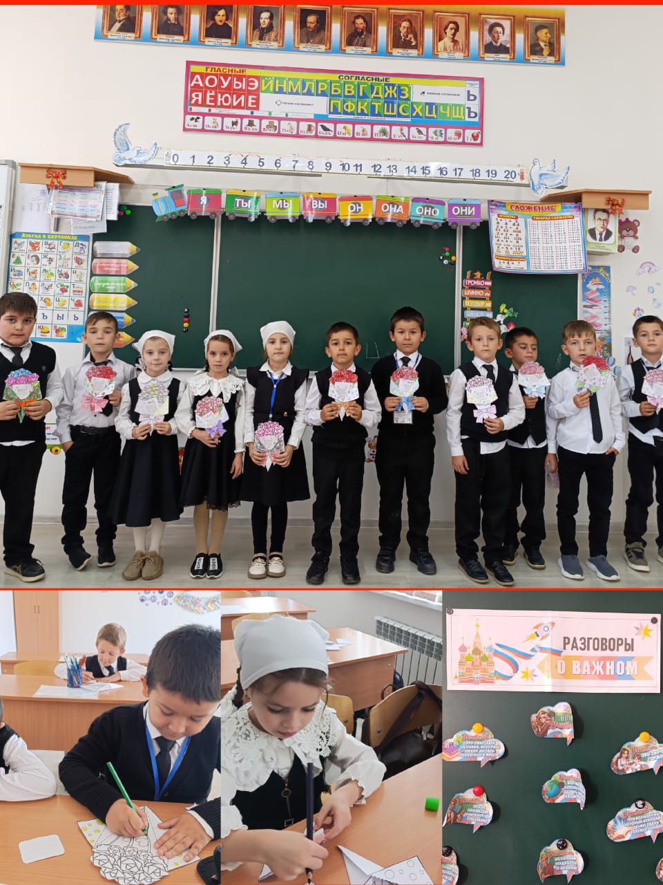 Так, классный руководитель 1 А класса МБОУ "СОШ #4 с.Ножай-Юрт" Догуева Л.С. провела внеурочное занятие "Разговоры о важном" на тему "День Учителя", а ребята из этого класса приняли участие в акции "Спасибо Учителю" и подарили педагогам открытки с пожеланиями.