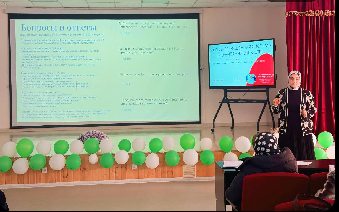 03.03.20253 марта 2025 года в нашей школе прошел районный семинар по теме «Средневзвешенная система оценивания в школе». Семинар провела завуч нашей школы Джабраилова Эсет Имрадиевна. Она ознакомила присутствующих с принципами применения и примерами расчета средневзвешенной системы оценивания.Данная методика вводится в наших школах с 1 марта 2025 года Средневзвешенная система оценки образовательных результатов представляет собой интегральную оценку результатов всех видов деятельности обучающихся в четвертях, триместрах, полугодиях, атакже ее учет при выставлении итоговой отметки. Средневзвешенная система оценки направлена на качественную подготовку обучающихся, глубокое усвоение ими изучаемого материала и включает всестороннююоценку достижения образовательных результатов в течение учебного года.Цель использования средневзвешенной системы оценки: - стимулировать учебно-познавательную деятельность обучающихся, осуществляяобъективное оценивание различных видов работ;- повышать качество изучения и усвоения материала; 17 мотивировать обучающихся к системной работе в процессе получения знаний и усвоения учебного материала на поотяжении всего учебного года. Подробно ознакомиться с презентацией Эсет Имрадиевны можно на нашем официальном сайте.