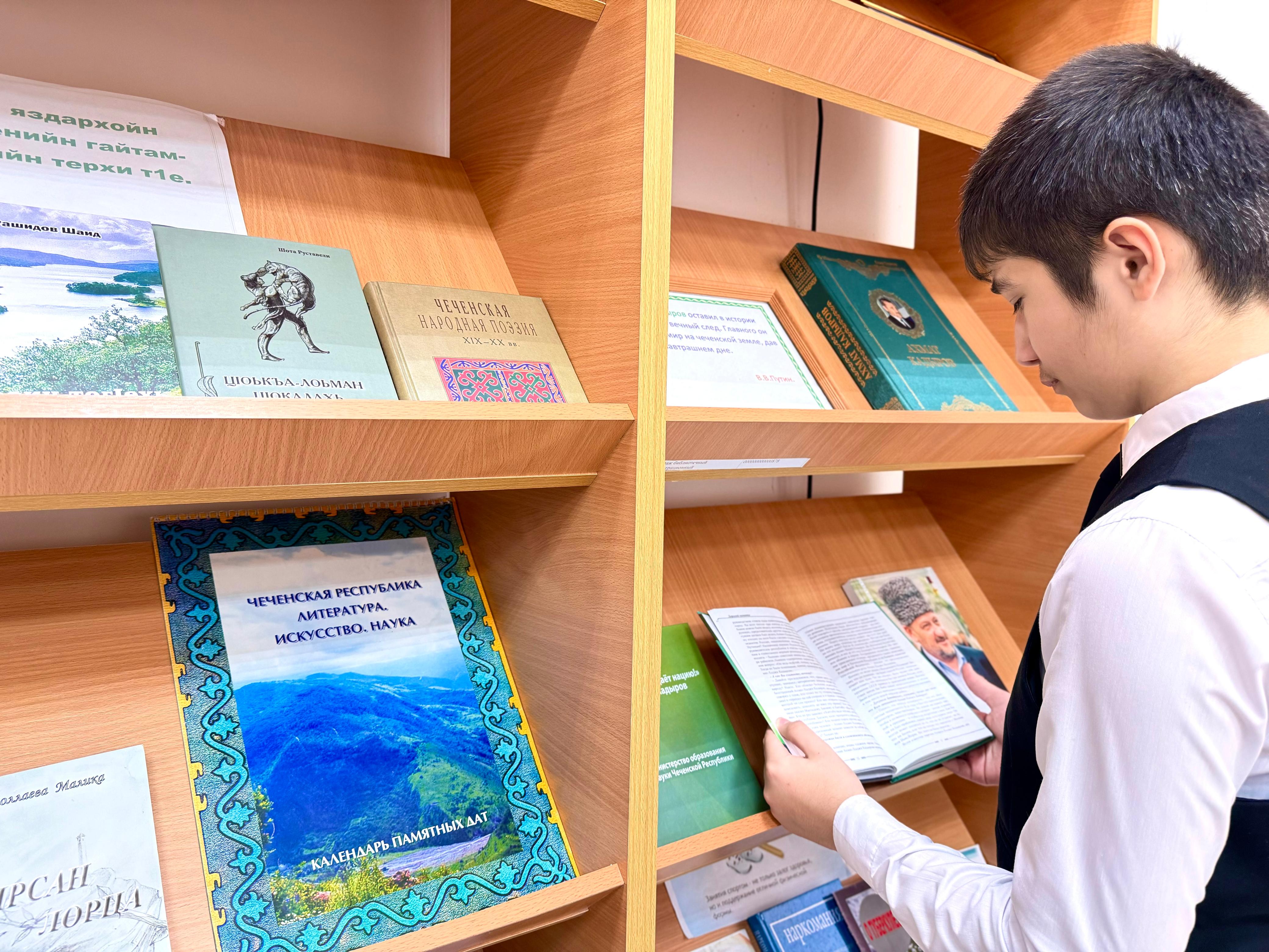 Сегодня в МБОУ «СОШ №4 с.Ножай-Юрт»в библиотеке школы проводилась книжная выставка произведений чеченских писателей «Нохчийн къоман йаздархой». Обучающимися были обсуждены стихи чеченских поэтов: Саидова Билала, Арсанукаева Шейхи, Айдамирова Абузара и др. Ахматханова Макка Хамсуркаевна показала присутствующим книгу Канты Ибрагимова. Она отметила, что в книге содержится богатейший материал по истории чеченского народа, а также биографии известных выходцев из нашего народа, а еще в ней содержится обширный иллюстративный материал. Ребята проявили интерес к данному изданию.