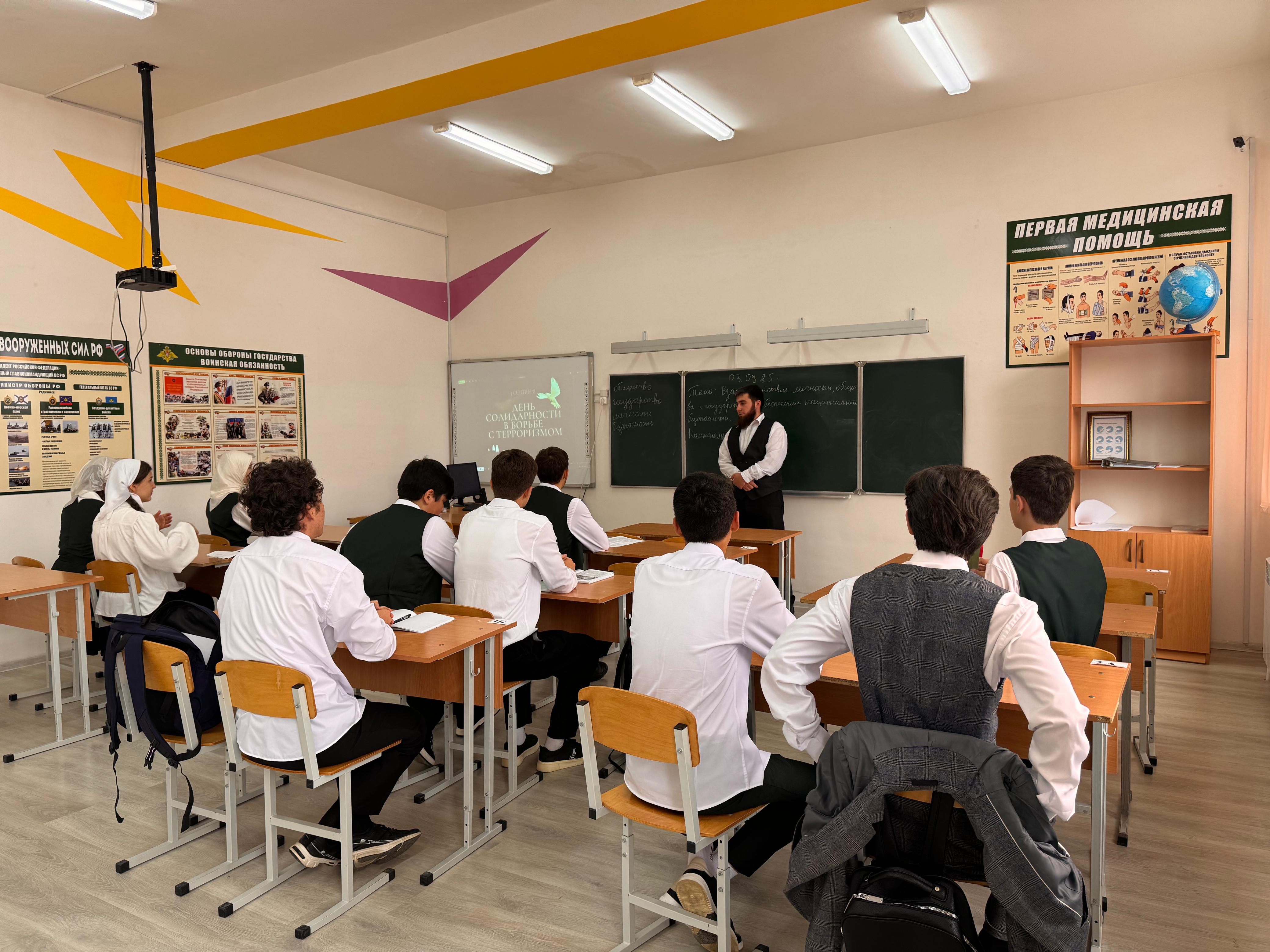 Сегодня, в День солидарности в борьбе с терроризмом, учитель истории Албасханов Мовсар Бай-Алиевич провёл урок, посвящённый одной из самых трагических страниц в истории России — событиям в Беслане. В ходе занятия учащиеся получили представление о масштабах и жестокости международного терроризма, а также о причинах активной борьбы с ним как в России, так и во всём мире. Особое внимание было уделено тому, что терроризм не имеет ни религии, ни национальности.